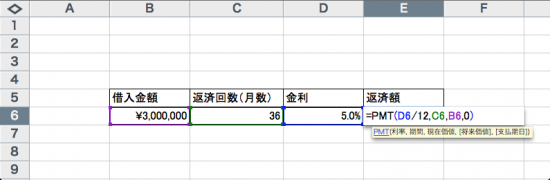 - 期間 ・・・返済回数です。利率と単位を揃えるので、毎月払いであれば年数×12をします。