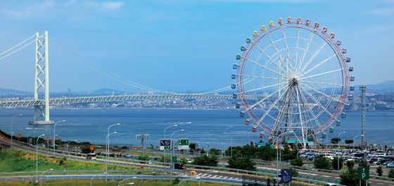 淡路サービスエリアは、明石海峡大橋の感動敵な景観を見ることができるパーキングエリアとして有名です。下り線側には、なんと大型の観覧車も。